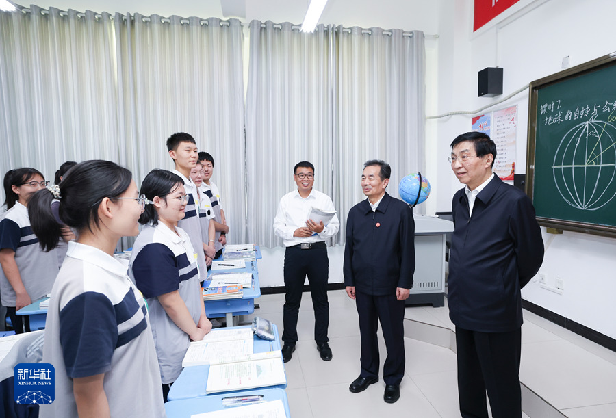 9月25日下午,受習近平總書記囑托,中共中央政治局常委、全國政協(xié)主席、中央代表團團長王滬寧帶領(lǐng)中央代表團部分成員在巴音郭楞蒙古自治州庫爾勒市看望慰問當?shù)馗髯甯刹咳罕姟_@是王滬寧和中央代表團部分成員在庫爾勒市第二十三中學考察教育援疆情況。新華社記者 姚大偉 攝