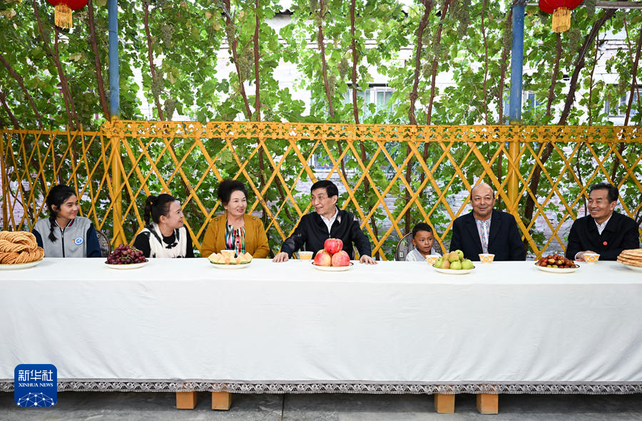 9月25日下午,受習近平總書記囑托,中共中央政治局常委、全國政協(xié)主席、中央代表團團長王滬寧帶領(lǐng)中央代表團部分成員在巴音郭楞蒙古自治州庫爾勒市看望慰問當?shù)馗髯甯刹咳罕姟_@是王滬寧和中央代表團部分成員在庫爾勒市阿瓦提鄉(xiāng)吾夏克鐵熱克村了解鄉(xiāng)村產(chǎn)業(yè)發(fā)展和群眾生產(chǎn)生活情況。新華社記者 張領(lǐng) 攝