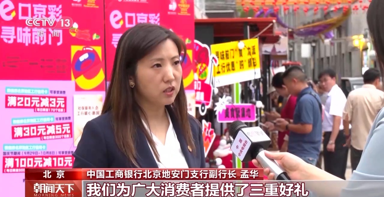 中國工商銀行北京地安門支行副行長 孟華:我們?yōu)閺V大消費(fèi)者提供了三重好禮,除了傳統(tǒng)的消費(fèi)滿減活動(dòng)以外,我們還疊加了數(shù)字人民幣的優(yōu)惠支付,同時(shí)還設(shè)計(jì)了數(shù)字人民幣的打卡活動(dòng)。