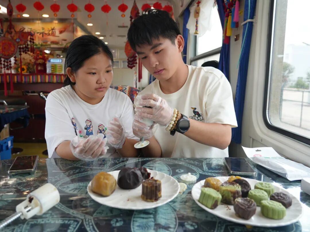 除了歌舞與燈謎,列車工作人員還精心準(zhǔn)備了互動體驗環(huán)節(jié)。旅客圍坐在一起,親手制作月餅、拼裝手工燈籠。工作人員還為參與活動的旅客送上書簽,大家提筆寫下對家人的中秋祝愿,字里行間滿是牽掛與祝福?;顒游猜?,身著漢服的列車工作人員端來一盤香甜的滇式月餅,邀請旅客品嘗。