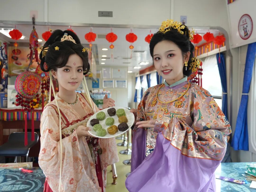 “旅客朋友們,歡迎乘坐本趟列車,中秋佳節(jié)將至,我們在2號餐車準(zhǔn)備了特色活動,誠邀大家共慶佳節(jié)!”列車長李文雯的聲音通過廣播傳遍車廂。隨即《納西三部曲》旋律響起——身著絢麗民族服飾的列車員們,拉著周圍旅客一同跳起納西族舞蹈,歡快的節(jié)奏瞬間點燃車廂氣氛。