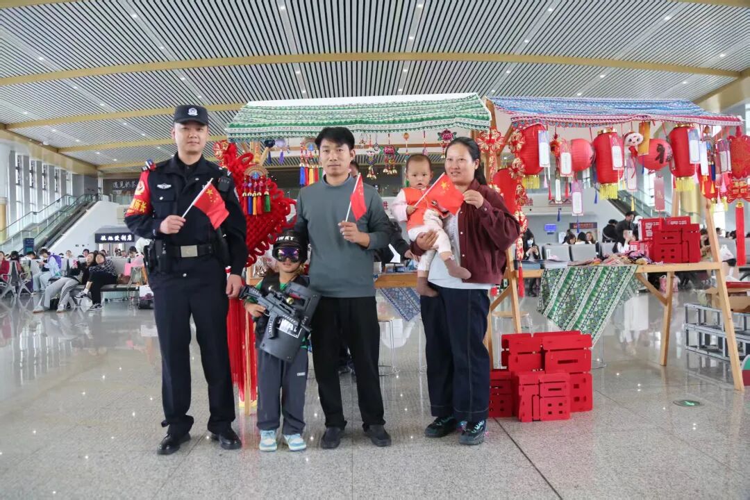 候車大廳內(nèi),紅色的國旗與中秋元素裝飾隨處可見。志愿者向旅客熱情遞上文旅宣傳冊,介紹紅河州特色景點與動車出行攻略。精彩的民族歌舞表演吸引了旅客紛紛駐足,他們舉起手機(jī)記錄下精彩瞬間。