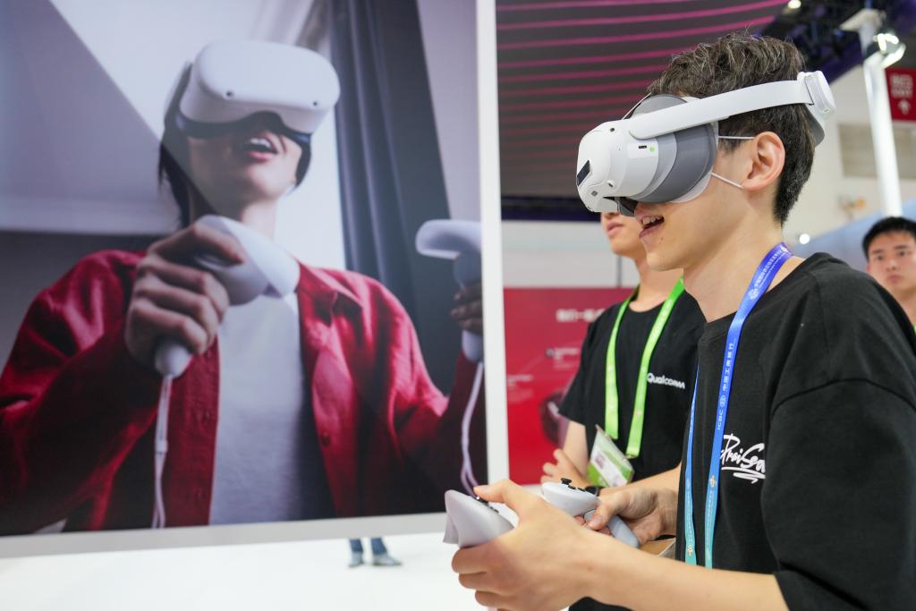 7月17日,參觀者在數(shù)字科技鏈展區(qū)高通展臺(tái)體驗(yàn)搭載了高通公司芯片的產(chǎn)品。新華社記者鞠煥宗攝