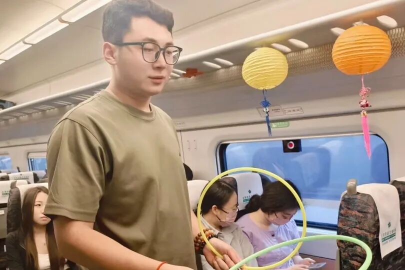 車廂內(nèi),懸掛的燈籠點(diǎn)綴出濃濃節(jié)日氣息。青年職工演唱歌曲《看月亮爬上來》,熟悉的旋律引發(fā)旅客共鳴;“舉頭望明月(打一中藥名)”等趣味猜燈謎活動(dòng),吸引不少旅客踴躍參與;身著漢服的乘務(wù)員帶領(lǐng)孩子們玩起傳統(tǒng)套圈游戲,月餅、玩偶作獎(jiǎng)品,歡聲笑語不斷。