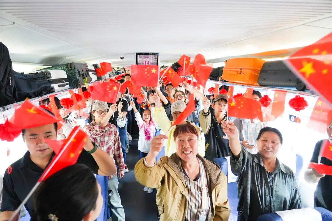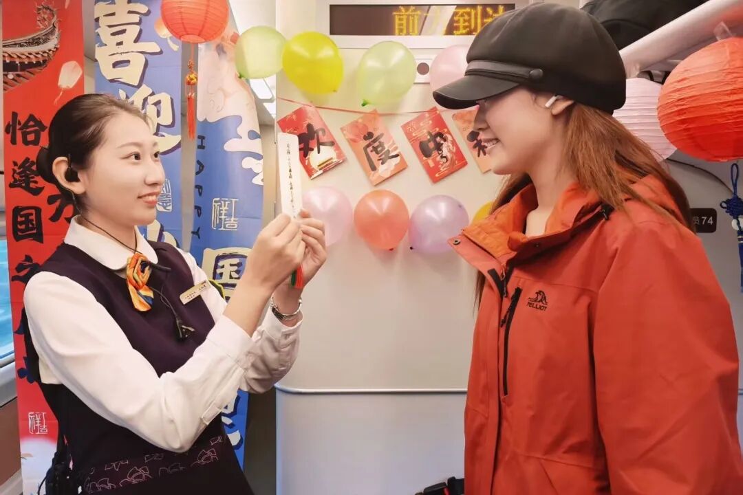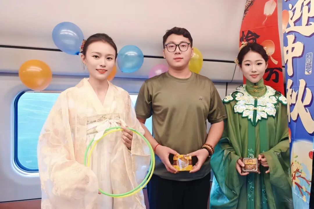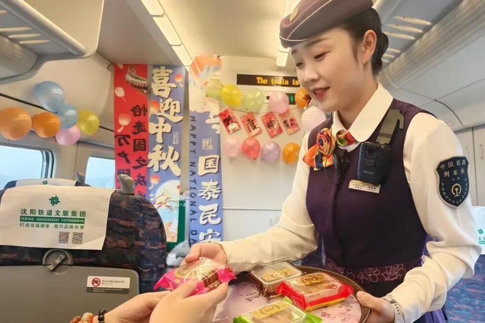 熱鬧的活動(dòng)讓車廂變成歡樂的海洋,列車員將月餅等精美伴手禮送給旅客,為他們送上節(jié)日的祝福。