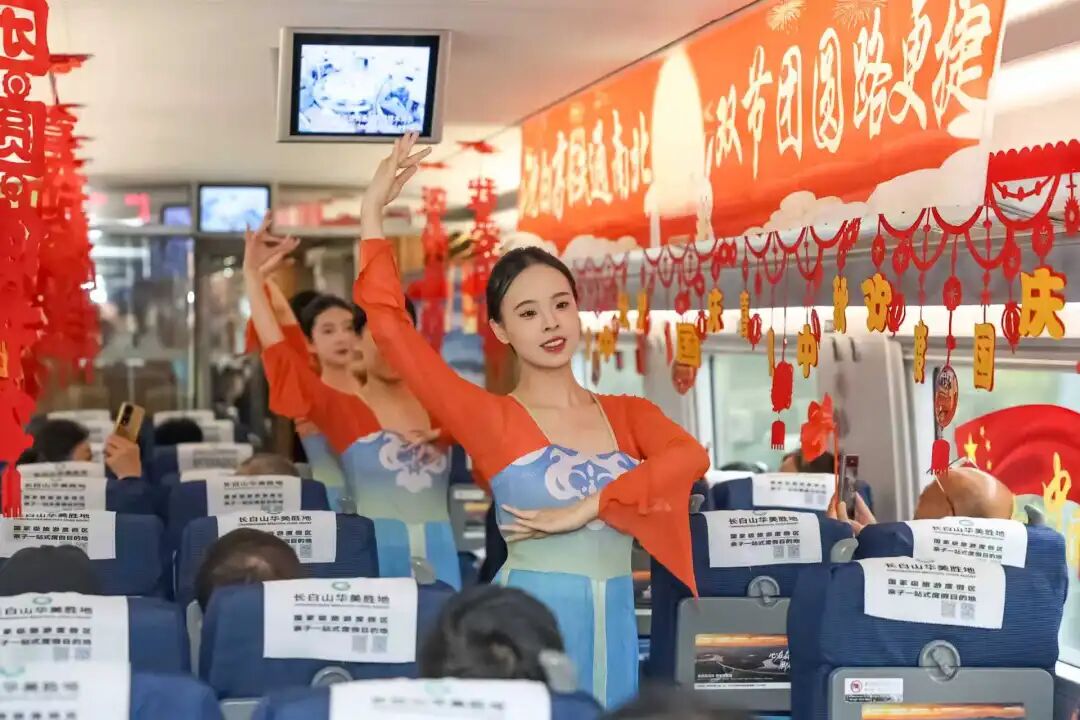 車廂內(nèi)掛滿條幅、彩帶和中國結(jié),洋溢著節(jié)日的喜慶氛圍。在舞蹈《親愛的你啊》的優(yōu)美旋律中,列車聯(lián)歡拉開序幕。