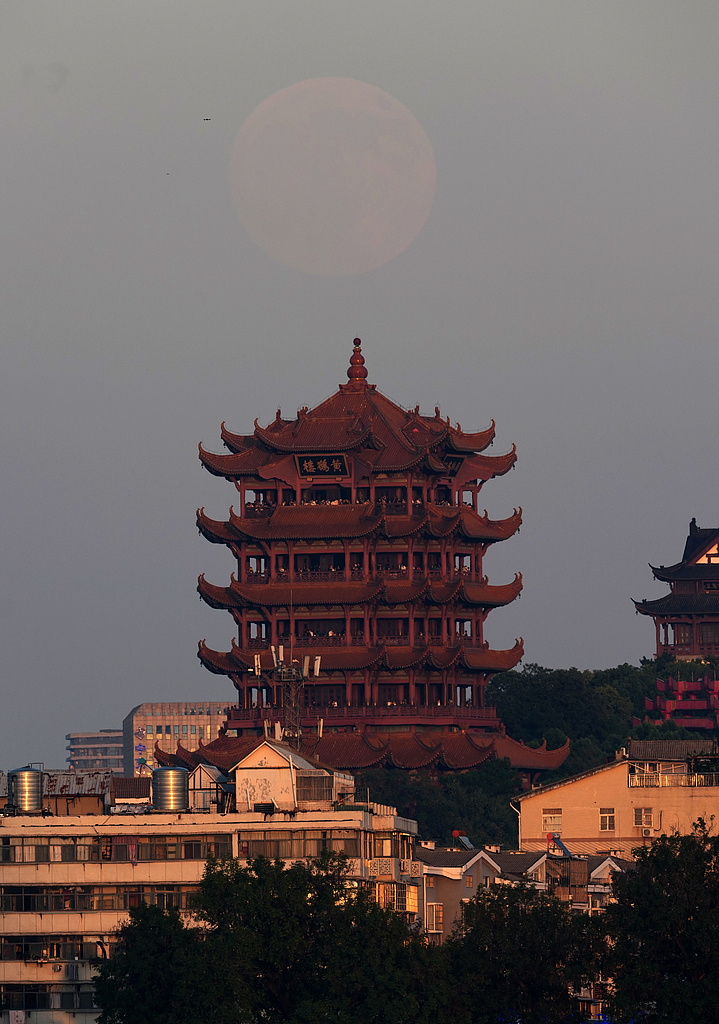 中秋佳節(jié),一輪明月從夕陽(yáng)和薄霧下的武漢黃鶴樓上緩緩升起,吸引了眾多市民前來觀看。