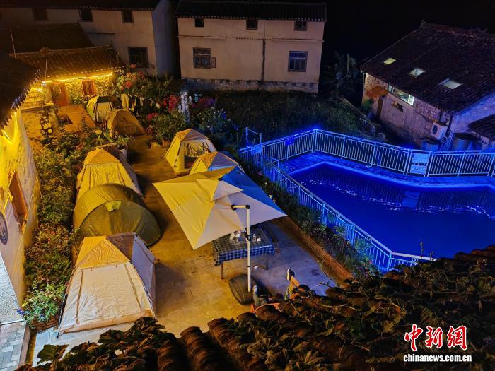 10月3日,游客在貴州省貞豐縣平街鄉(xiāng)花江村村民林國權(quán)的民宿院子內(nèi)搭帳篷。(受訪者供圖)
