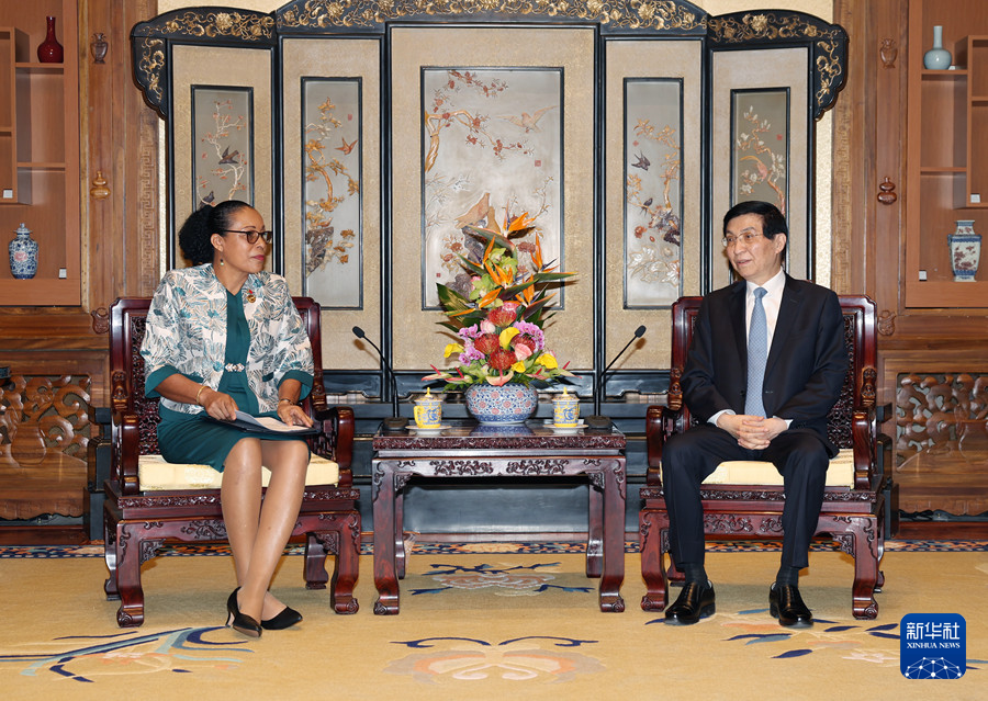 全國政協(xié)主席王滬寧14日在京會見來華出席全球婦女峰會的多米尼克總統(tǒng)伯頓。