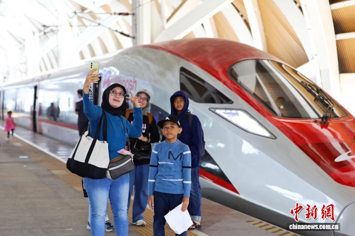 當(dāng)?shù)貢r間6月26日,旅客在印尼雅加達(dá)哈利姆高鐵站與列車合影。雅萬高鐵由中印尼兩國合作建設(shè),最高運營時速350公里?!≈行律缬浾?李志全 攝