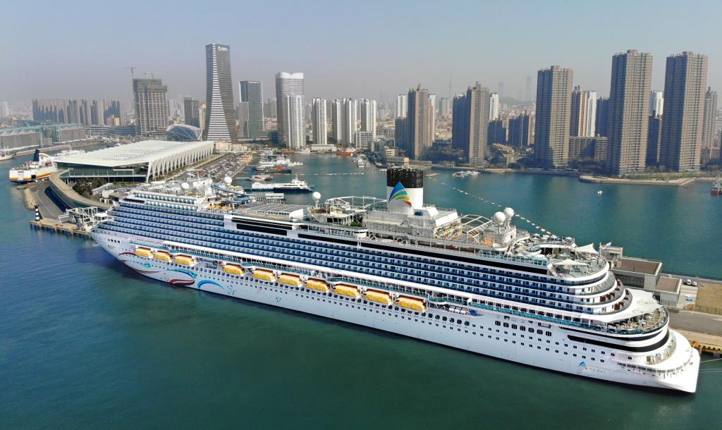 “愛達(dá)·魔都號”郵輪靠泊在青島郵輪母港碼頭(無人機(jī)照片)。新華社記者 李紫恒 攝
