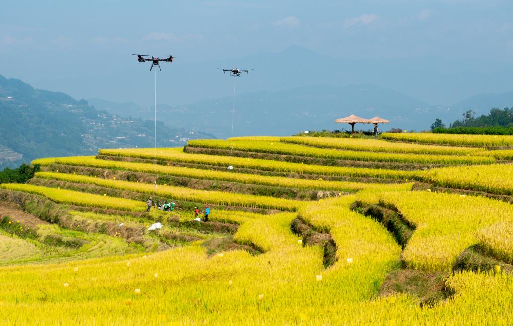 10月10日,湖北省秭歸縣沙鎮(zhèn)溪鎮(zhèn)長春村村民用無人機(jī)轉(zhuǎn)運收獲的水稻(無人機(jī)照片)。新華社發(fā)(雷勇攝)
