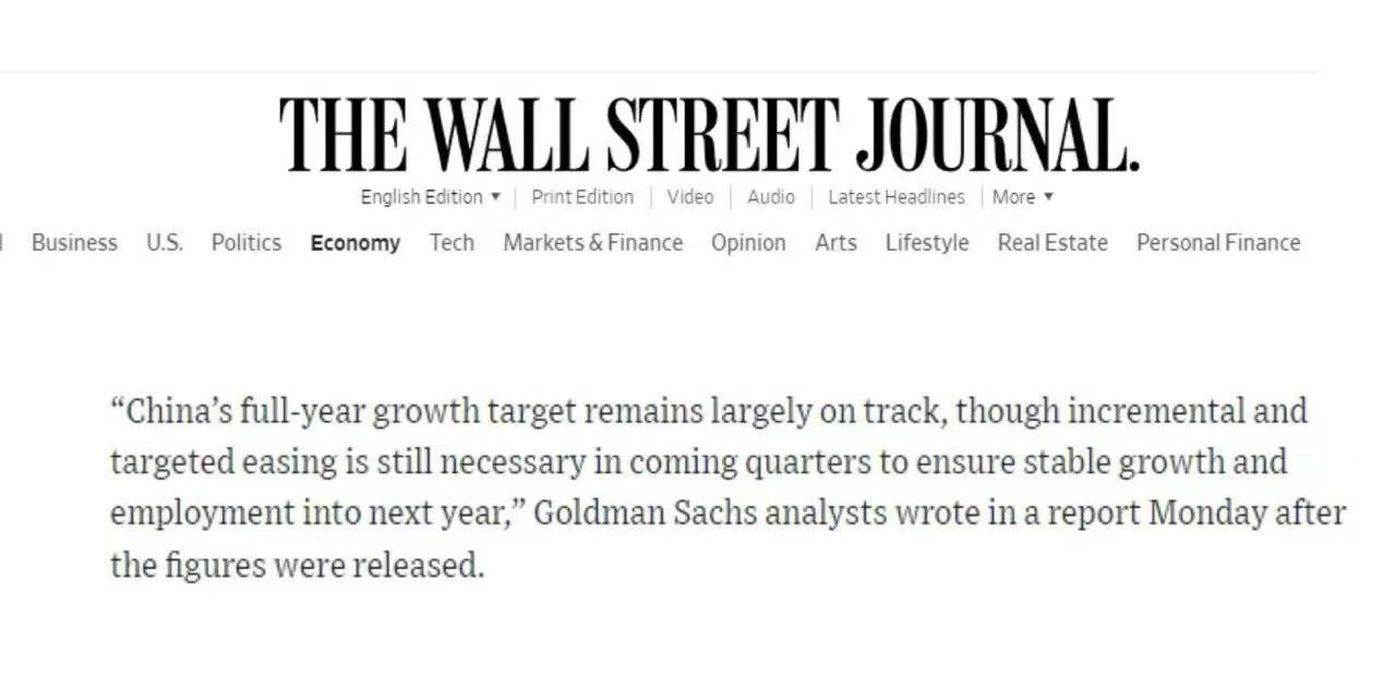 美國《華爾街日報》報道顯示,2023年前三季度中國GDP同比增長5.2%,意味著"5%左右"的年度增長目標已基本達成。報道援引高盛分析師觀點稱,雖然未來幾個季度仍需實施漸進式、結(jié)構(gòu)性的寬松政策,但全年經(jīng)濟增速仍將總體符合預(yù)期。
