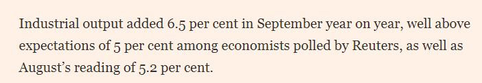 英國《金融時報》的文章分析說,9月規(guī)模以上工業(yè)增加值同比增長6.5%,顯著高于路透社調(diào)查經(jīng)濟學家預(yù)期的5%及8月的5.2%。荷蘭國際集團(ING)經(jīng)濟學家分析稱,超預(yù)期表現(xiàn)主要源于外需拉動。文章說,上周,海關(guān)數(shù)據(jù)顯示,中國出口保持韌性,9月同比增長8.3%,對東南亞等地區(qū)出口持續(xù)增長。