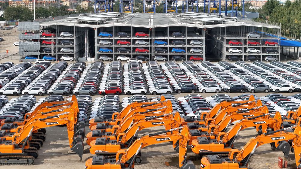 10月20日,國(guó)產(chǎn)汽車和工程機(jī)械在山東港口煙臺(tái)港集結(jié)等待裝船出口(無(wú)人機(jī)照片)。新華社發(fā)(唐克 攝)