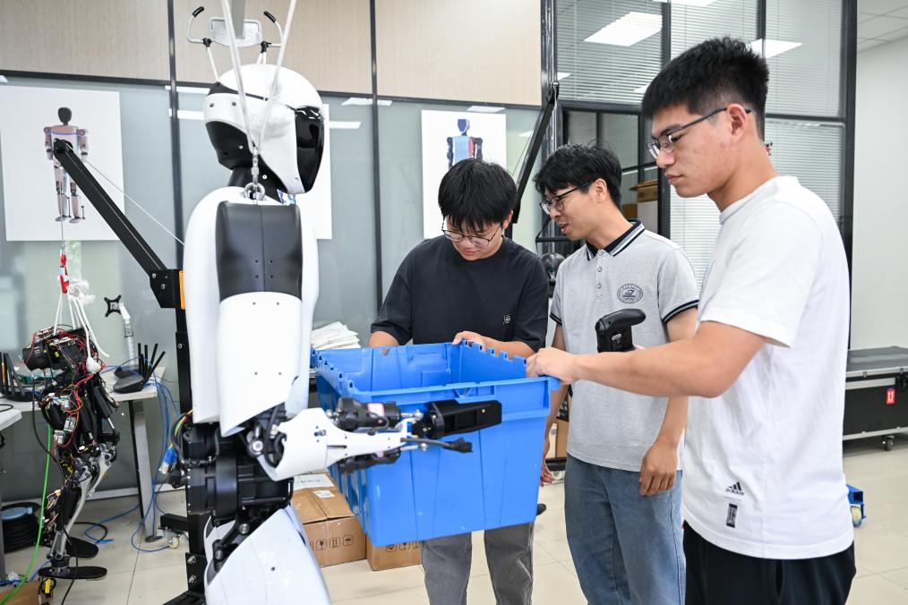 2025年5月29日,華中科技大學(xué)機(jī)械科學(xué)與工程學(xué)院,學(xué)生對(duì)“荊楚”人形機(jī)器人進(jìn)行搬運(yùn)測(cè)試。新華社記者 杜子璇 攝
