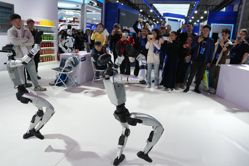 ↑ 11月6日,觀眾在2025年世界互聯(lián)網(wǎng)大會“互聯(lián)網(wǎng)之光”博覽會現(xiàn)場觀摩人形機器人跳舞。新華社記者 黃宗治 攝