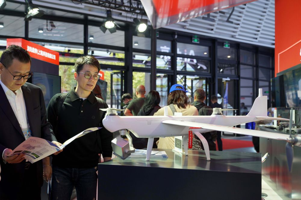 ↑ 11月6日,嘉賓在觀看可提供空中巡檢服務的“道通龍魚 Pro”垂直起降固定翼。新華社記者趙宇思攝