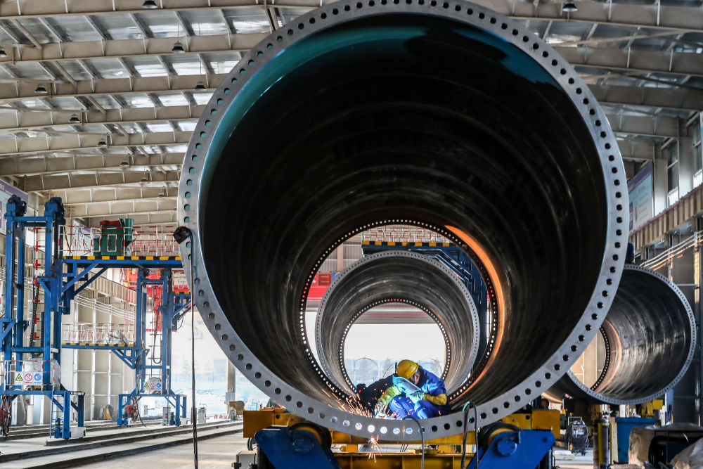 11月20日,在甘肅省酒泉經(jīng)濟(jì)技術(shù)開(kāi)發(fā)區(qū)的中國(guó)水電四局(酒泉)新能源裝備有限公司塔筒制造車(chē)間,工作人員進(jìn)行風(fēng)機(jī)塔筒焊接作業(yè)。新華社記者 郎兵兵 攝