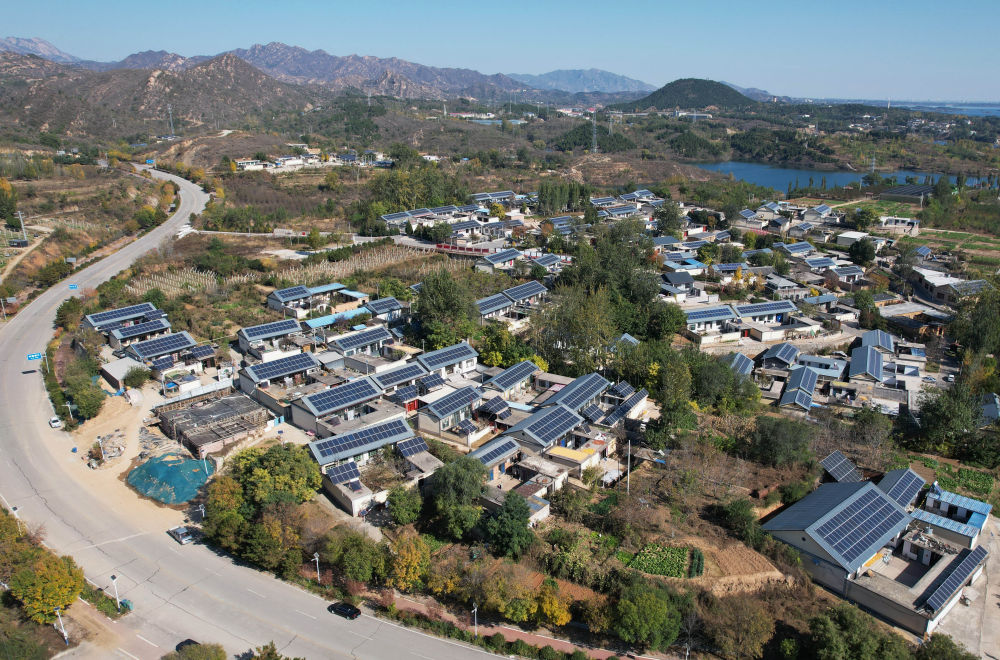 11月2日拍攝的河北省平山縣西柏坡鎮(zhèn)北莊村兆瓦級(jí)“光儲(chǔ)”智能微電網(wǎng)示范工程項(xiàng)目中的屋頂光伏發(fā)電板(無(wú)人機(jī)照片)。新華社記者 楊世堯 攝