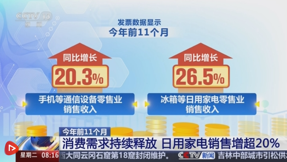 發(fā)票數(shù)據(jù)顯示,2025年前11個(gè)月,手機(jī)等通信設(shè)備零售業(yè)、冰箱等日用家電零售業(yè)銷(xiāo)售收入同比分別增長(zhǎng)20.3%、26.5%。新能源汽車(chē)消費(fèi)也持續(xù)向好,新能源乘用車(chē)銷(xiāo)售收入同比增長(zhǎng)19.1%。同時(shí),文旅市場(chǎng)新業(yè)態(tài)新場(chǎng)景不斷涌現(xiàn),激發(fā)消費(fèi)活力持續(xù)增強(qiáng)。