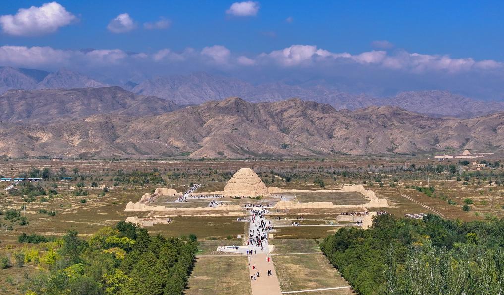 2025年10月2日,游客在西夏陵遺址區(qū)參觀三號(hào)陵(無人機(jī)照片)。新華社記者 馮開華 攝