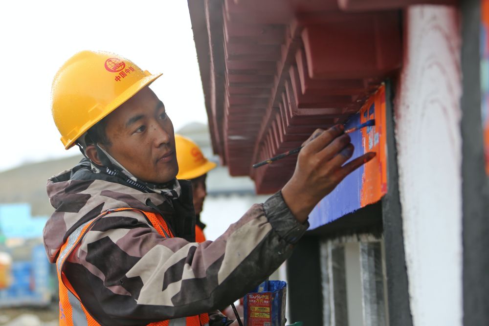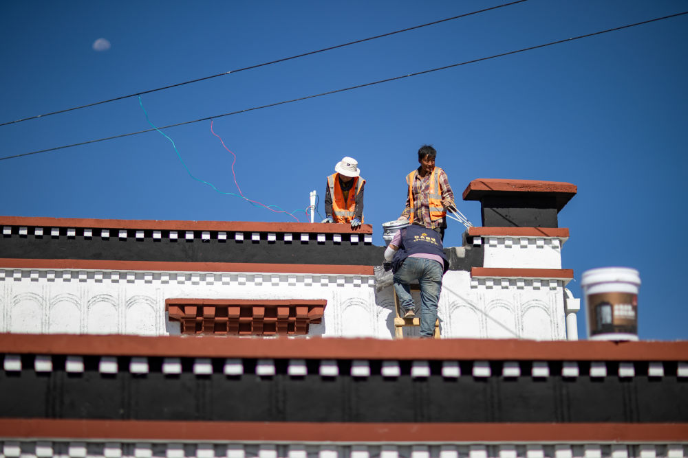 2025年8月11日,定日縣曲洛鄉(xiāng)措昂村彩繪工匠扎西、旦增貢加、拉巴在工作現(xiàn)場(chǎng)。他們都是本村受災(zāi)群眾,通過(guò)參與新房建設(shè)獲得勞動(dòng)報(bào)酬。