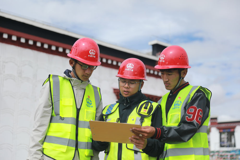 2025年8月10日,技術(shù)人員在中國(guó)中鐵定日縣曲洛鄉(xiāng)措昂村民房恢復(fù)重建項(xiàng)目施工現(xiàn)場(chǎng)商討方案。