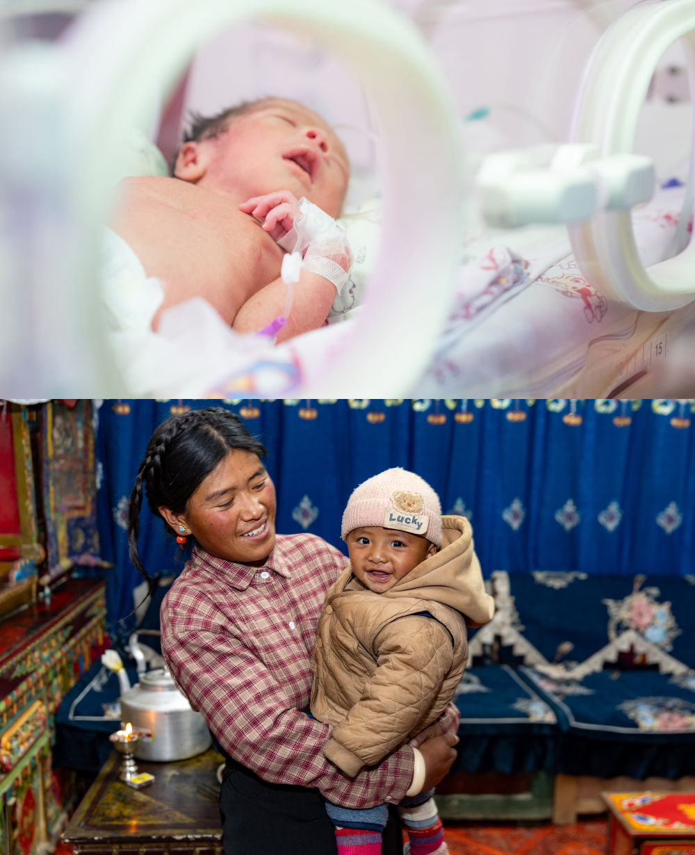 拼版照片:上圖為2025年1月9日,地震中第一個(gè)出生的“地震寶寶”次仁拉巴(1月8日7時(shí)40分左右出生)在日喀則市人民醫(yī)院新生兒科病房睡覺(jué)。下圖為2025年11月11日,次仁拉巴和媽媽強(qiáng)瓊在新房里。