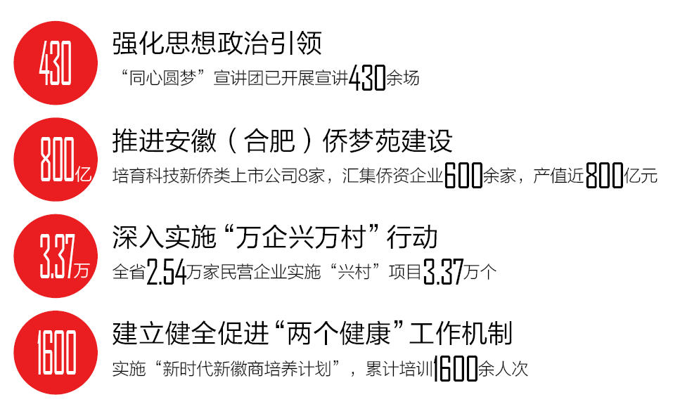 堅持和落實“兩個毫不動搖”,建立健全促進(jìn)“兩個健康”工作機(jī)制。持續(xù)優(yōu)化民營經(jīng)濟(jì)發(fā)展環(huán)境,促進(jìn)經(jīng)濟(jì)社會高質(zhì)量發(fā)展。召開全省民營經(jīng)濟(jì)統(tǒng)戰(zhàn)工作會議,明確36項重點任務(wù)和55家責(zé)任單位,建立13家省直單位組成的聯(lián)席會議制度。聚焦凝心鑄魂,全省統(tǒng)戰(zhàn)系統(tǒng)累計開展理想信念教育和經(jīng)濟(jì)形勢政策教育808場次,覆蓋3.82萬人次民營經(jīng)濟(jì)人士。突出年輕一代培育,實施“新時代新徽商培養(yǎng)計劃”,累計培訓(xùn)1600余人次,建立約2500人的代表人士數(shù)據(jù)庫,推動青年商會組織省市全覆蓋,推薦4300余名優(yōu)秀青年企業(yè)家進(jìn)入各級人大、政協(xié)。引導(dǎo)企業(yè)履行社會責(zé)任,完成光彩事業(yè)發(fā)起實施30周年相關(guān)調(diào)研及先進(jìn)典型推薦宣傳工作。
