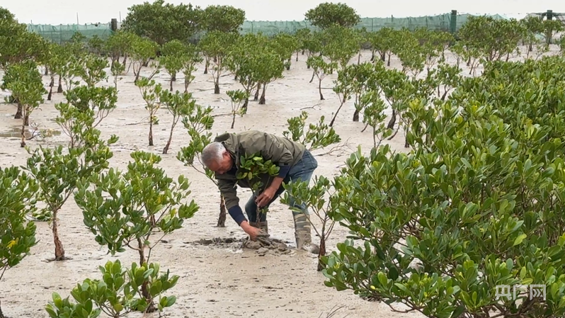 吳昌根輕輕地將灘涂上倒伏的紅樹幼苗扶正(央廣網(wǎng)記者 李曉曉 攝)