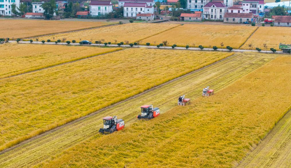 2025年10月30日,在江蘇省南通市通州區(qū)十總鎮(zhèn)育民村高標準農(nóng)田里,村民駕駛農(nóng)機收割水稻(無人機照片)。新華社發(fā)(翟慧勇攝)