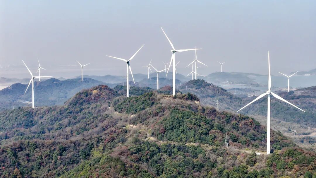 12月3日,在江西九江市湖口縣舜德鄉(xiāng)高橋村,風力發(fā)電機組矗立青山間,不斷輸送綠色清潔能源。張玉攝