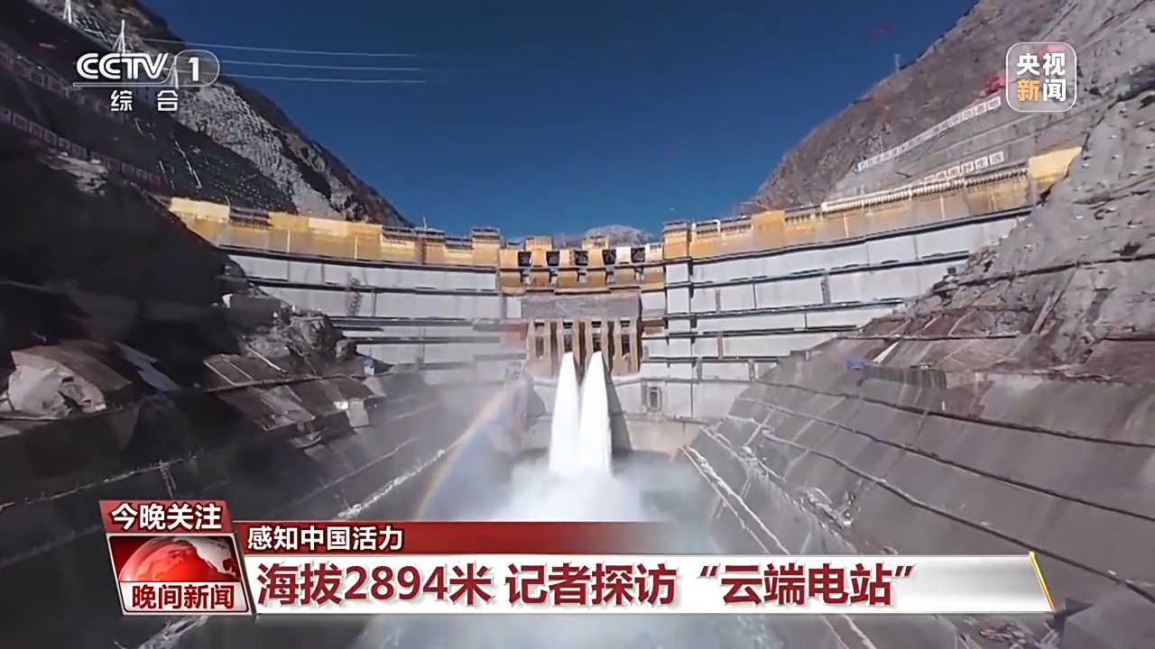 總臺(tái)央視記者古峻嶺在海拔2894米的葉巴灘水電站壩頂介紹,隨著首批機(jī)組投產(chǎn),葉巴灘成為金沙江上游已投產(chǎn)的最大水電站。站在壩頂望去,兩條白色水柱如同巨龍,正從大壩中間的泄流孔道噴涌而出,陽光照射在水霧之上,一道斑斕的彩虹隨之浮現(xiàn)。這座建設(shè)歷時(shí)近10年的水電站,于27日發(fā)出了第一度綠電。