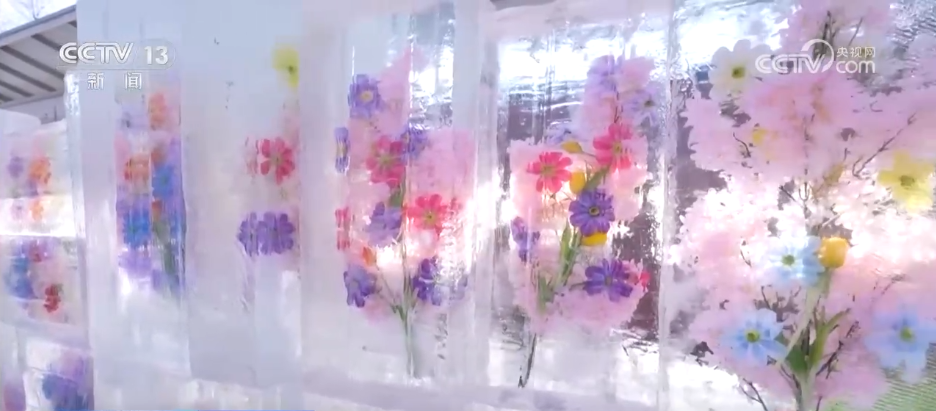 看完了霧凇,剛才說到的冰雕在哪里呢?大家看這面鮮花冰墻就是進(jìn)入冰雕觀賞區(qū)的標(biāo)志:它以冰塊為載體,嵌入了青海本土的郁金香、格?;?,還有西寧市花丁香花,嬌艷色彩與冰晶的純凈相互映襯。