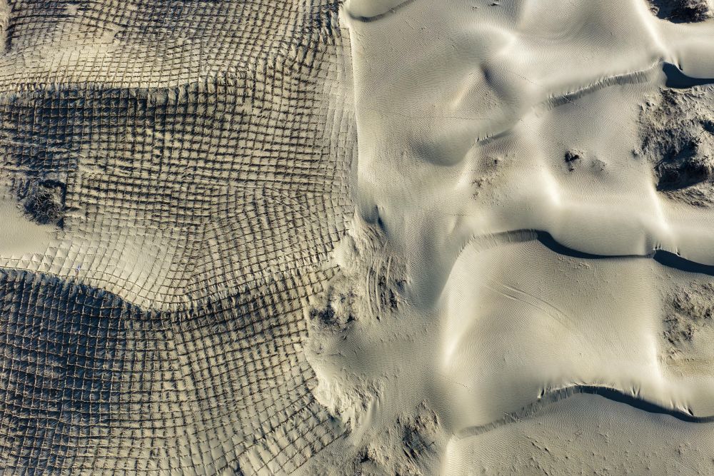 這是在新疆和田地區(qū)墨玉縣喀瓦克鄉(xiāng)周邊沙漠拍攝的草方格(1月11日攝,無(wú)人機(jī)照片)。新華社記者 丁磊 攝