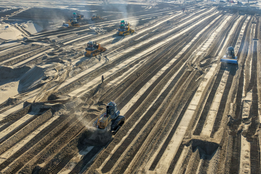 隆冬時(shí)節(jié),塔克拉瑪干沙漠西南緣的新疆和田地區(qū)墨玉縣,治沙現(xiàn)場(chǎng)熱火朝天。數(shù)十臺(tái)推土機(jī)轟鳴著向沙漠腹地挺進(jìn),起伏的沙丘漸趨平整;不遠(yuǎn)處,一束束干蘆葦被嵌入沙層,縱橫交錯(cuò)的草方格如同堅(jiān)實(shí)的“沙漠鎖扣”,牢牢鎖住流動(dòng)黃沙。
