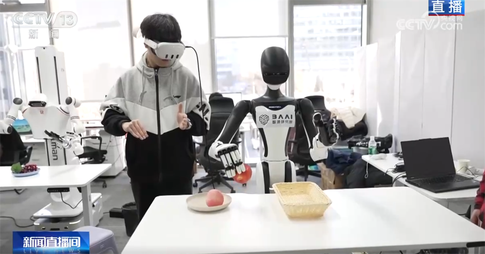 那您可能要問了,老師教學(xué)生講究一個(gè)“言傳身教”,那么,訓(xùn)練師和機(jī)器人之間是怎么交流的呢?您看,這位戴著VR眼鏡、拿著操作手柄的訓(xùn)練師就正在給這臺(tái)機(jī)器人上課。還有您看,當(dāng)訓(xùn)練師按操作鍵時(shí),機(jī)器人的手臂可以移動(dòng)、手指也會(huì)進(jìn)行抓取。還有的訓(xùn)練師會(huì)穿上布滿傳感器的動(dòng)作捕捉衣,讓機(jī)器人可以在更精準(zhǔn)的數(shù)據(jù)指導(dǎo)下進(jìn)行訓(xùn)練。機(jī)器人就是在這些數(shù)據(jù)的傳輸中,一遍一遍模仿,反復(fù)練習(xí),從而提高每個(gè)動(dòng)作的精準(zhǔn)度。