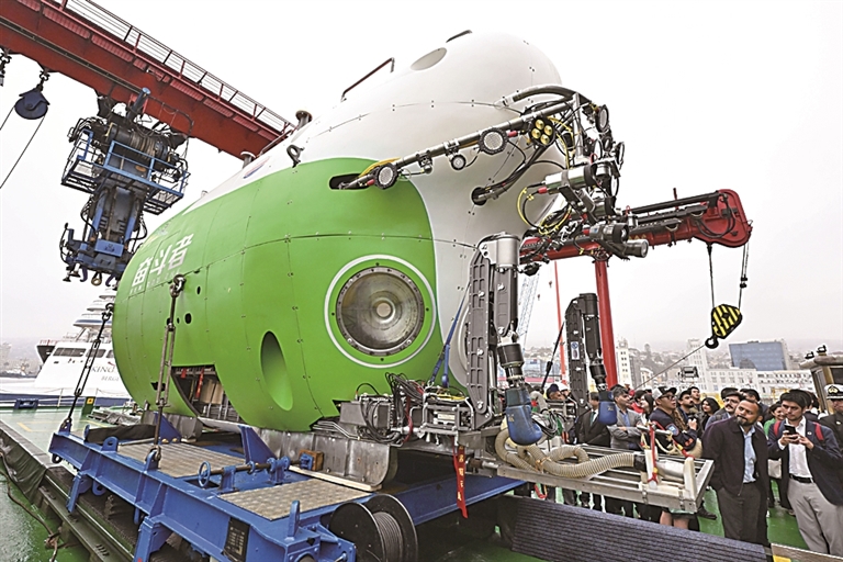 在??坑谥抢胁客郀柵寥R索港的中國“探索一號”科考船上,人們參觀“奮斗者”號載人潛水器。新華社發(fā)