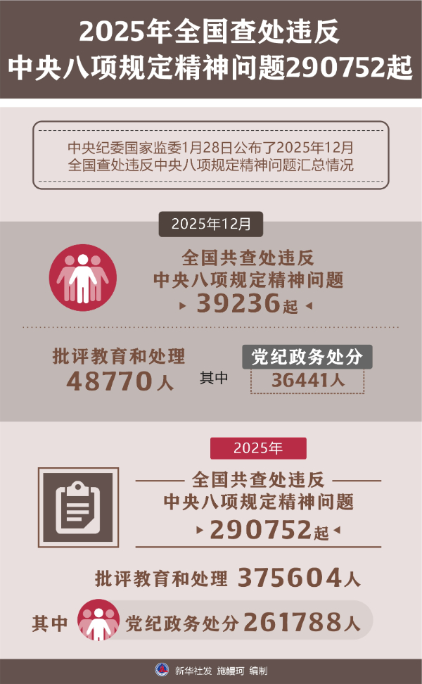 中央紀(jì)委國(guó)家監(jiān)委28日公布了2025年12月全國(guó)查處違反中央八項(xiàng)規(guī)定精神問(wèn)題匯總情況。當(dāng)月,全國(guó)共查處違反中央八項(xiàng)規(guī)定精神問(wèn)題39236起,批評(píng)教育和處理48770人,其中黨紀(jì)政務(wù)處分36441人。2025年,全國(guó)共查處違反中央八項(xiàng)規(guī)定精神問(wèn)題290752起,批評(píng)教育和處理375604人,其中黨紀(jì)政務(wù)處分261788人。