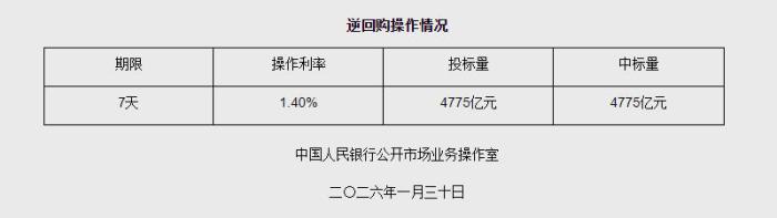 據(jù)央行網(wǎng)站消息,2026年1月30日中國人民銀行以固定利率、數(shù)量招標方式開展了4775億元7天期逆回購操作。具體情況如下: