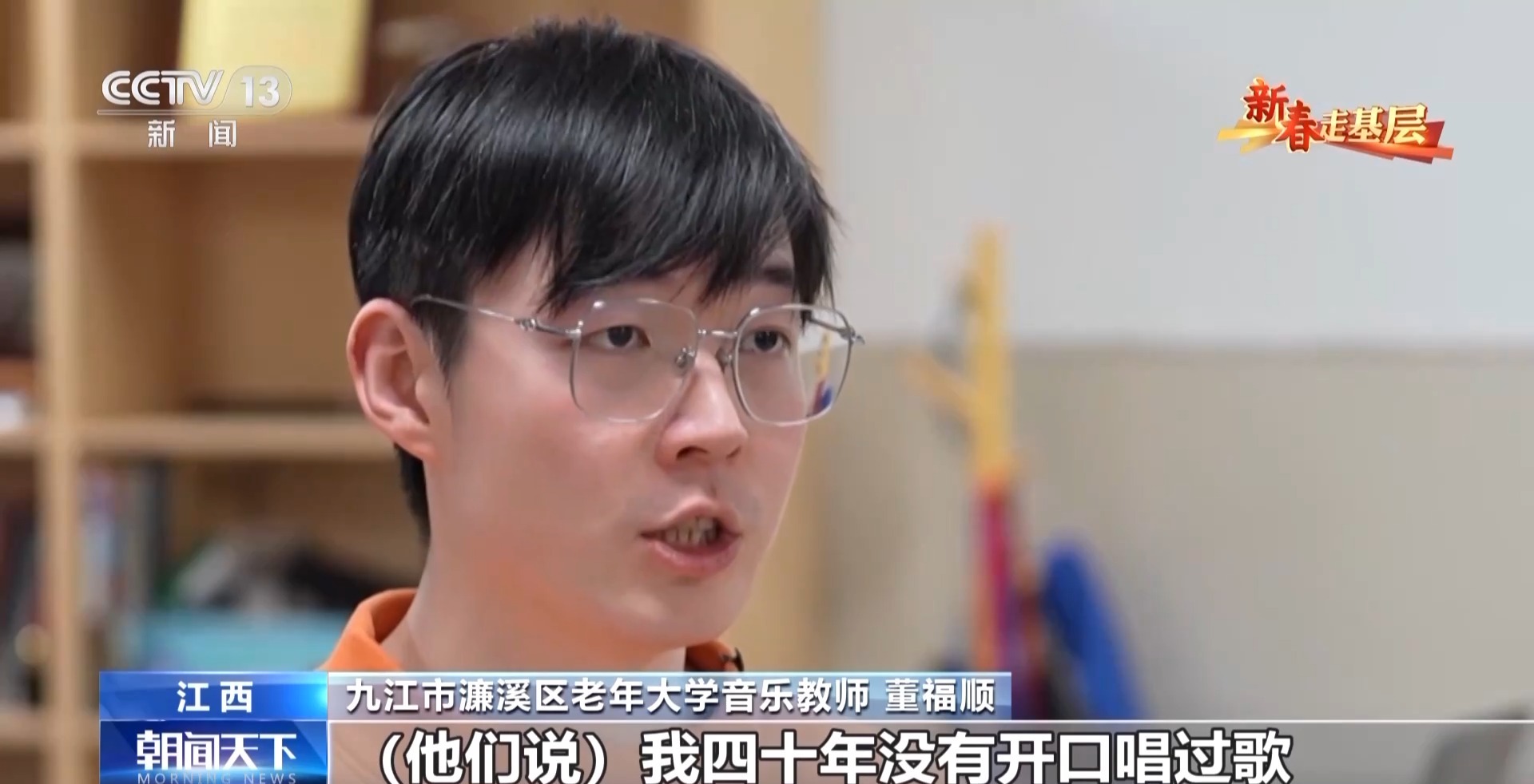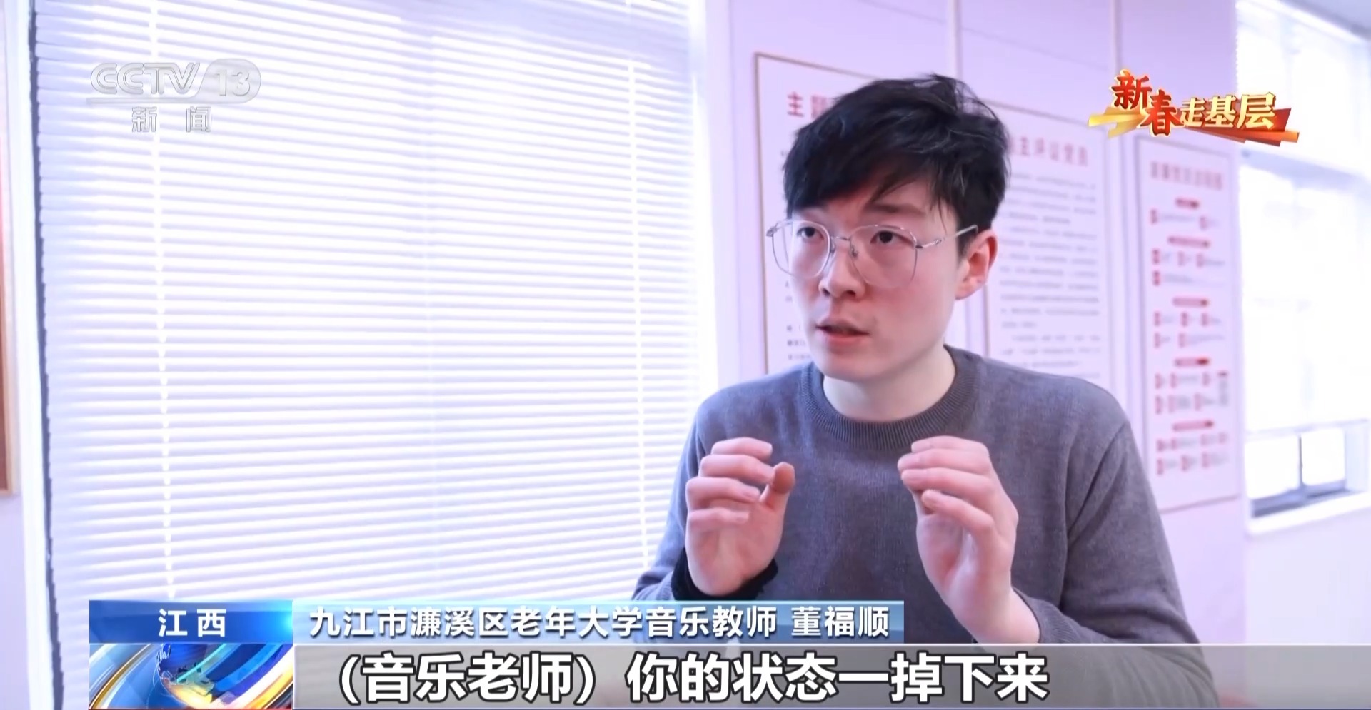 九江市濂溪區(qū)老年大學(xué)音樂教師 董福順:我去了之后,他們說我四十年沒有開口唱過歌,已經(jīng)很久很久,他們說都快忘了這首歌的歌詞了,你過來了,讓我想起了它。所以我覺得我又一次被認可了,我也覺得是他們在給我一點能量,當(dāng)看著他們唱回憶起的這些歌曲的時候,他們坐直了,開始朝我揮手去唱,我覺得這件事做對了。
