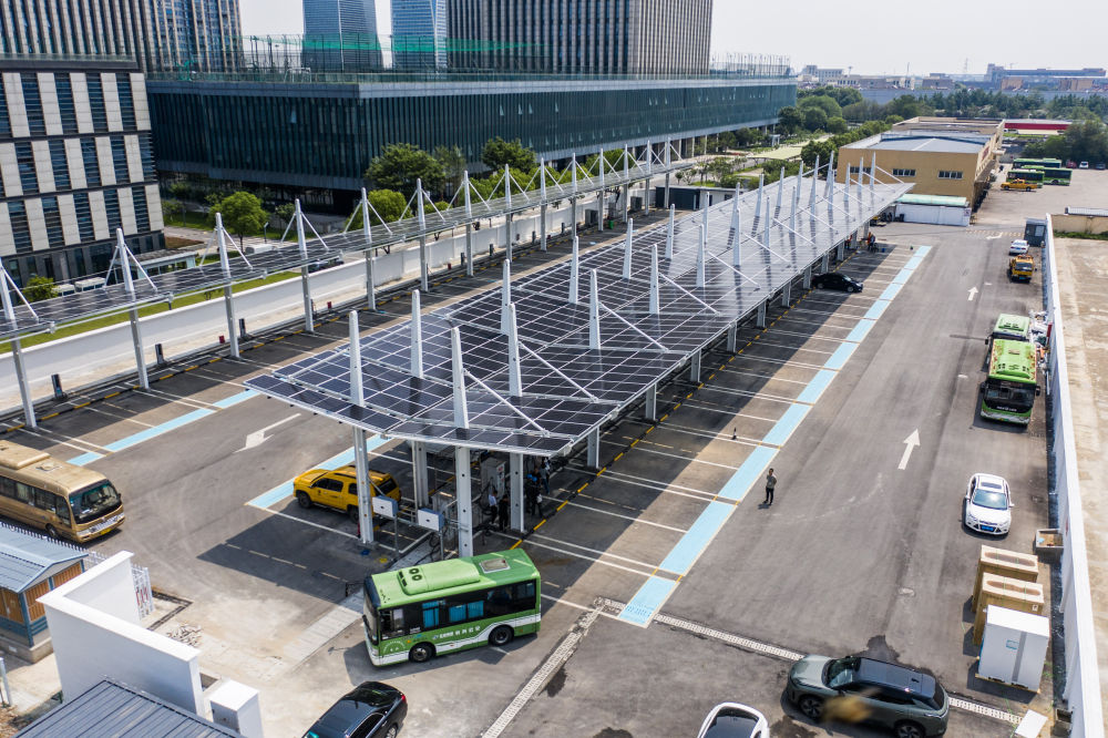 2025年5月27日拍攝的浙江省湖州市長興公交總站光儲充一體化公交充電站(無人機照片)。新華社記者 徐昱 攝