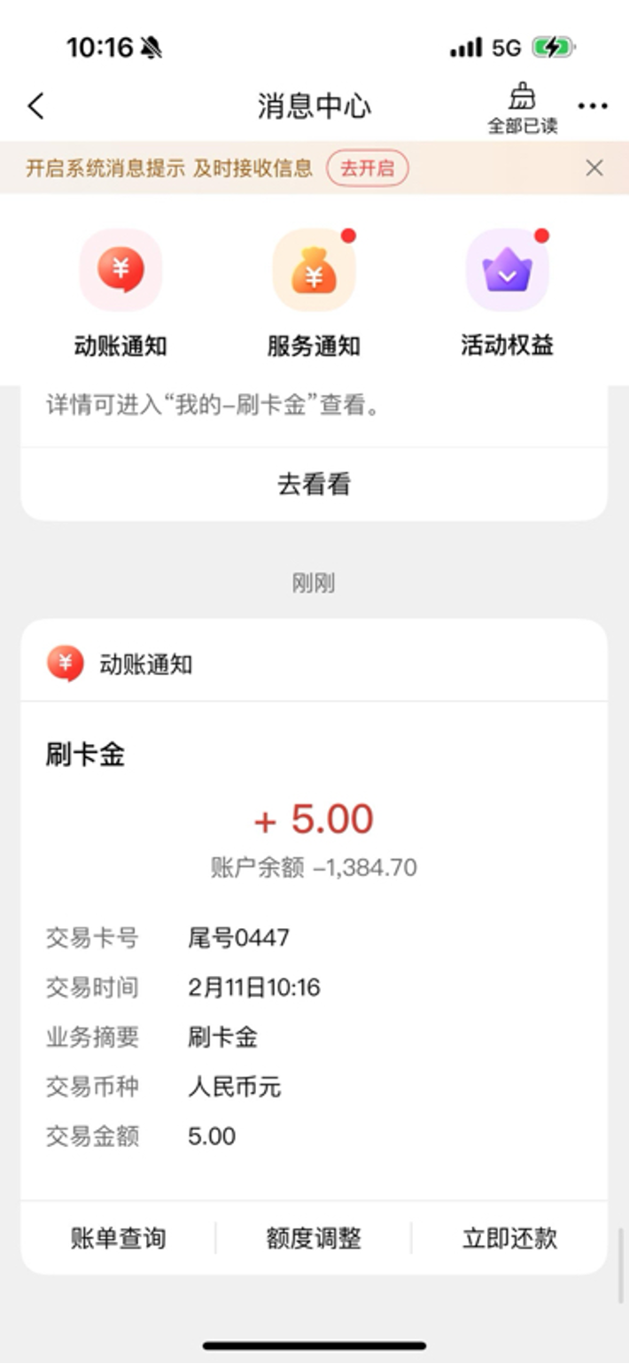 在工銀e支付收銀臺完成符合刷卡金核銷門檻的消費。完成滿足條件的消費后,刷卡金將立即匯入客戶的消費賬戶中,可以通過工銀e生活A(yù)pp消息中心查看入賬信息。