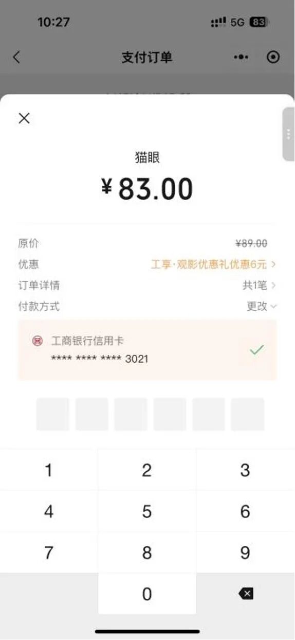 登錄貓眼App或微信小程序,進入電影頻道,進行影院/影票/場次選擇,隨后進入訂單頁,確認(rèn)后選擇用微信支付,并用綁定的工行卡結(jié)賬可確認(rèn)最終優(yōu)惠信息(用戶在此步驟才能看到實際優(yōu)惠)。