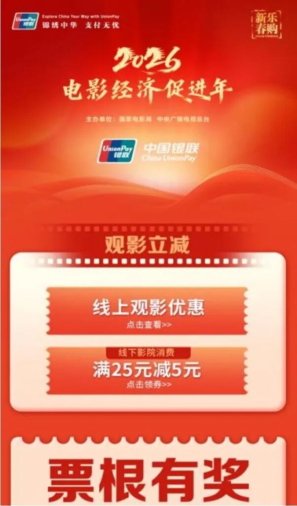 用戶可以通過云閃付App“2026電影經(jīng)濟促進年”專題頁面進行領(lǐng)取觀影福利以及參加票根抽獎活動。(可在云閃付App首頁宣傳欄進入,或搜索“電影經(jīng)濟促進年”后,進入專題頁面)