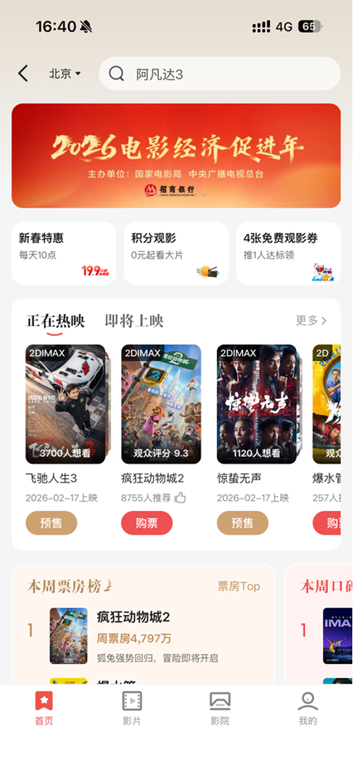 2026年2月13日至23日,招商銀行個人信用卡持卡用戶在掌上生活A(yù)pp搜“影票”購買電影票,可享“19.9元起觀影”活動,每天上午10點開搶。數(shù)量有限,先到先得。