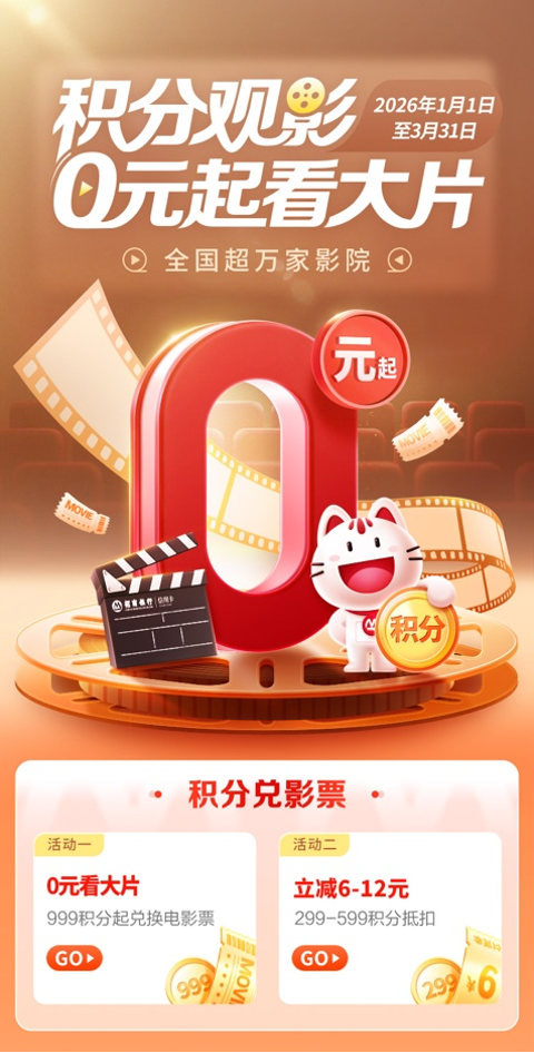 即日起至2026年3月31日,招商銀行個人信用卡持卡用戶在掌上生活A(yù)pp搜“影票”購買電影票,可參與“999積分起兌電影票”和“299-599積分兌換6-12元立減優(yōu)惠”活動。