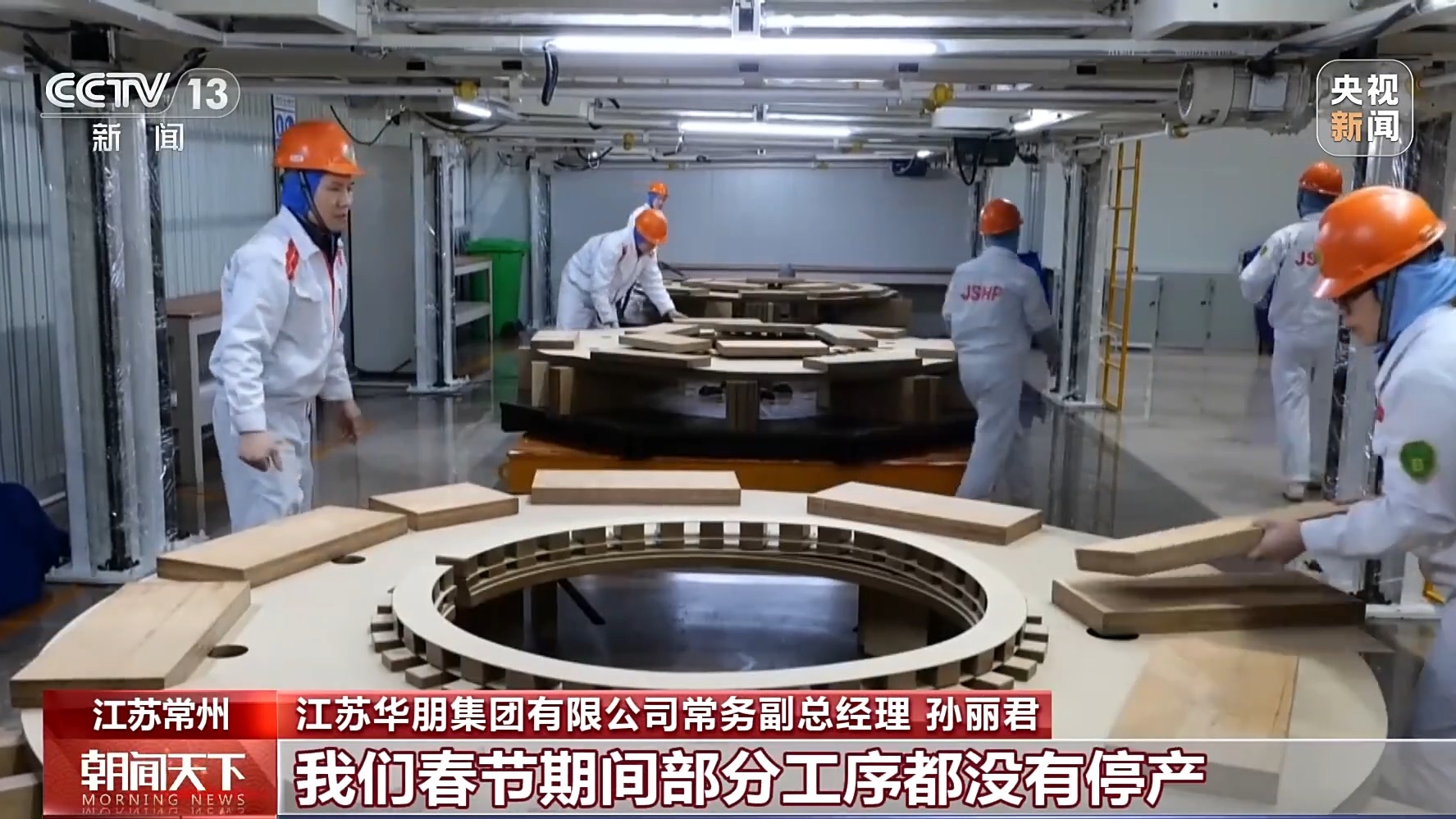 江蘇華朋集團(tuán)有限公司常務(wù)副總經(jīng)理 孫麗君:眼下,我們在手訂單已超過30億元,其中出口訂單超過20億元,現(xiàn)在訂單已經(jīng)排到年底。為了搶抓工期,確保訂單按時交付,我們春節(jié)期間部分工序都沒有停產(chǎn)。
