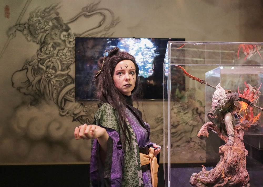 2025年8月20日,在德國科隆,一名《黑神話:悟空》游戲角色扮演者在游戲科學展臺與模型合影。